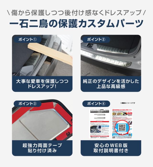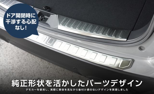 ラゲッジスカッフプレートは、荷物の積み下ろし時に付きやすいキズや汚れから車体をガードするだけでなく、製品の外周に装着済みの保護ゴムが車体への接触ダメージを最小限に抑えます。