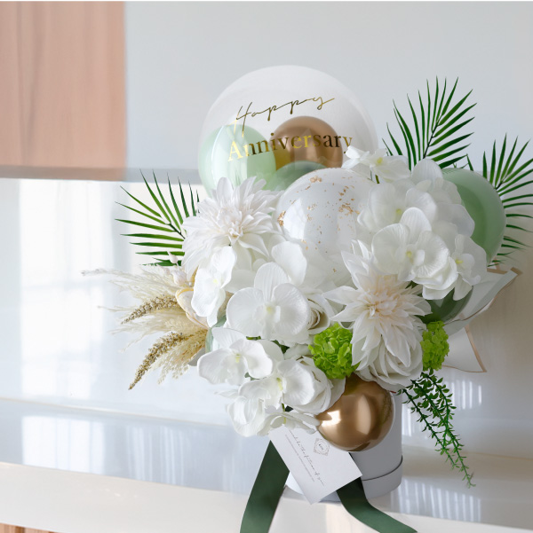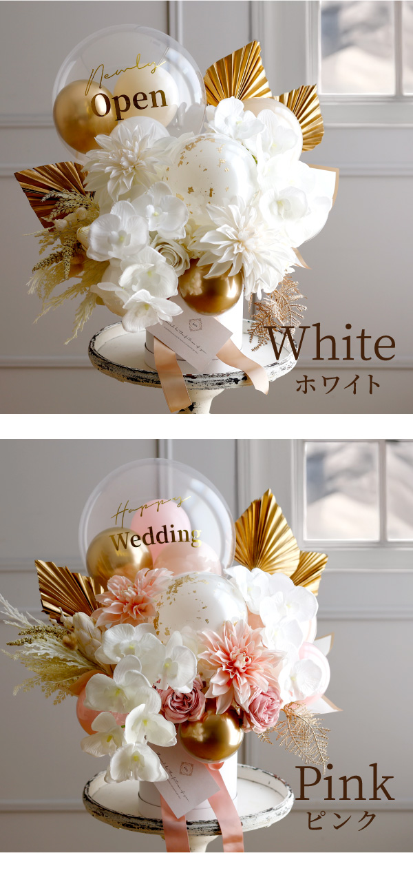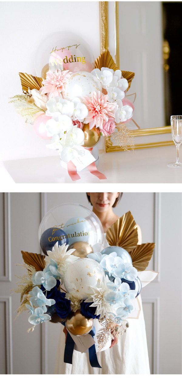 幸運を招く、二本立ち胡蝶蘭をイメージした華やかでエレガントなバルーンアレンジメント。 寄り添う二本の花が「対」と「絆」を象徴し、結婚式や開店祝いを華やかに彩ります。 商売繁盛の金色を基調にホワイト・ピンク・ブルー・グリーンを組み合わせた上品な色合い。 空間を一気に明るくし、「幸運が舞い込む特別な場所」という印象を与えます。 開店祝いはもちろん、周年記念や誕生日、結婚式など幅広いお祝いにおすすめです。