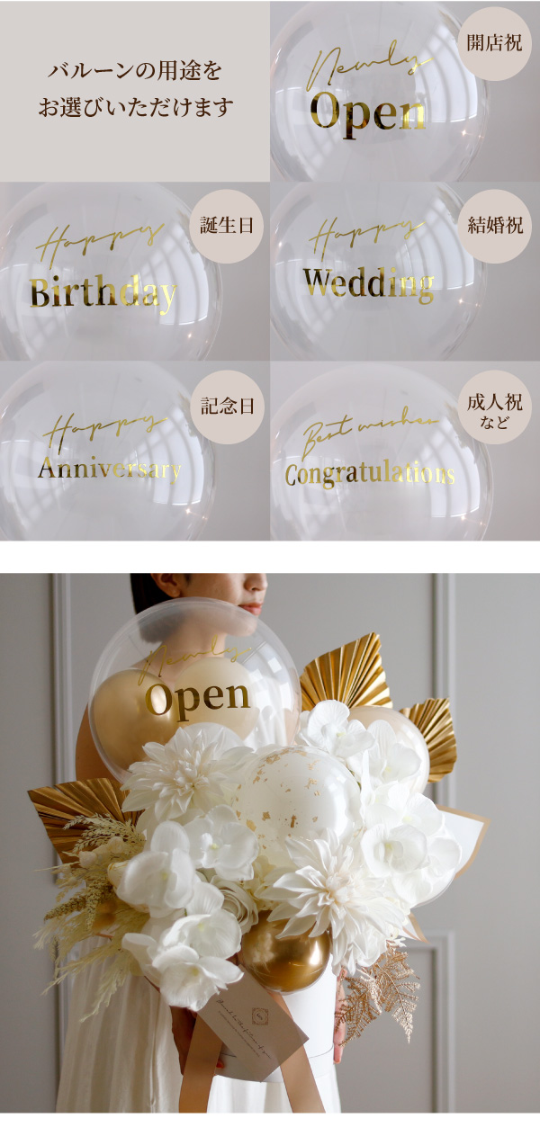 | 用途 | 開店祝い 周年祝い 開院祝い 開業祝い オープン祝い 新事務所設立 祝電 バルーン電報 エステサロン ネイルサロン 病院 バー 企業 |