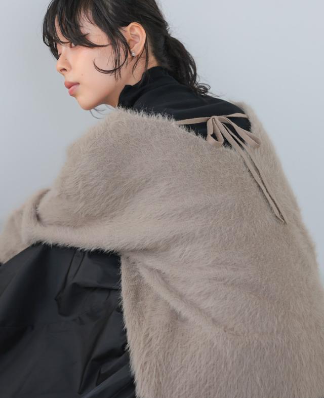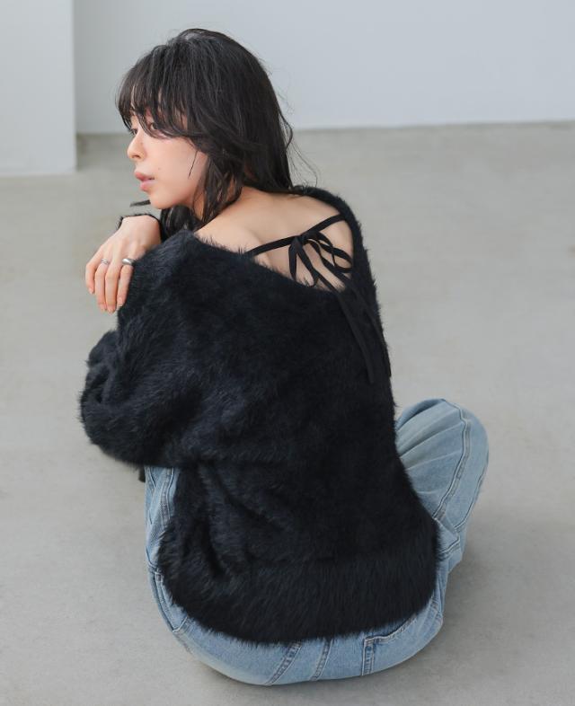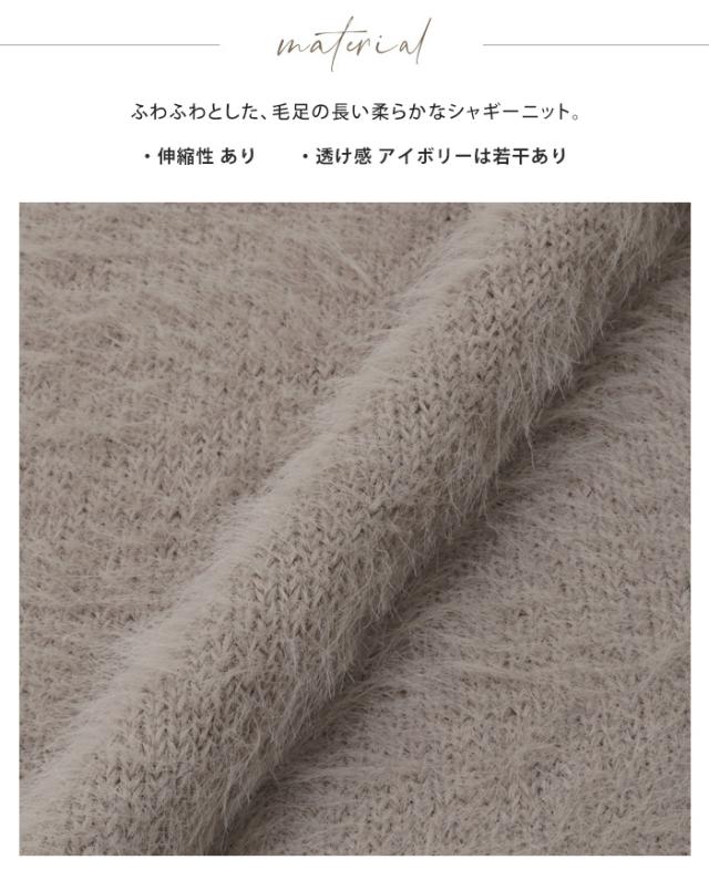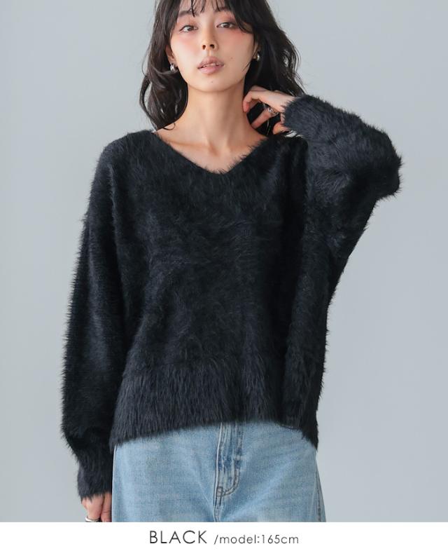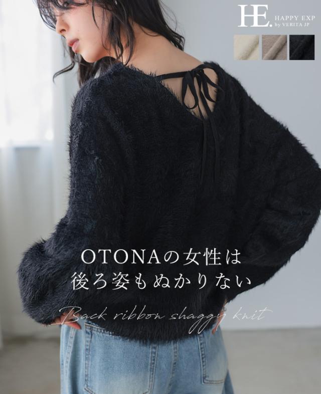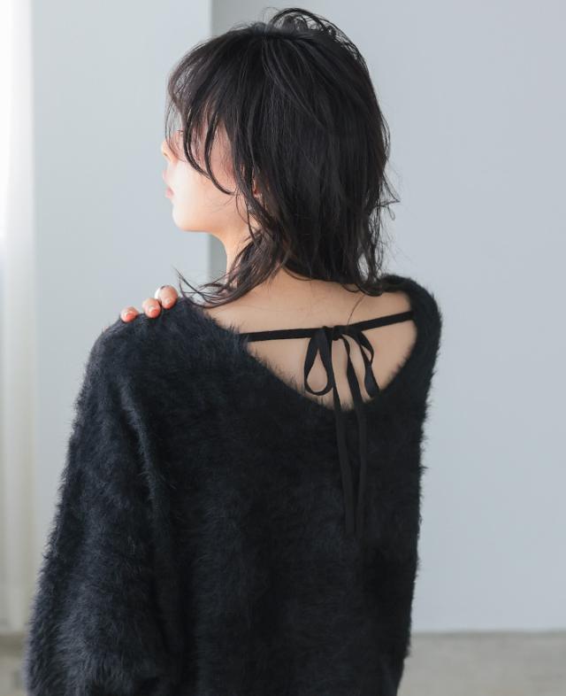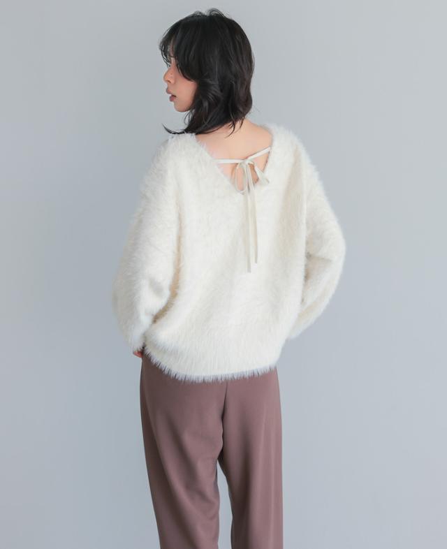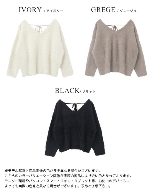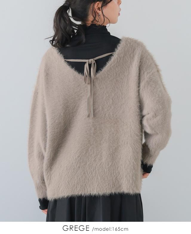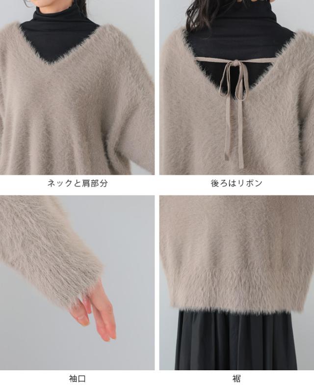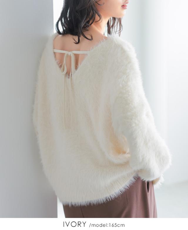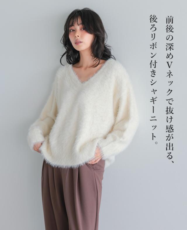 後ろリボンシャギーニット レディース トップス 長袖 Vネック 無地 シャギー リボン バックリボン きれいめ 体型カバー 秋新作 秋冬【メール便不可】