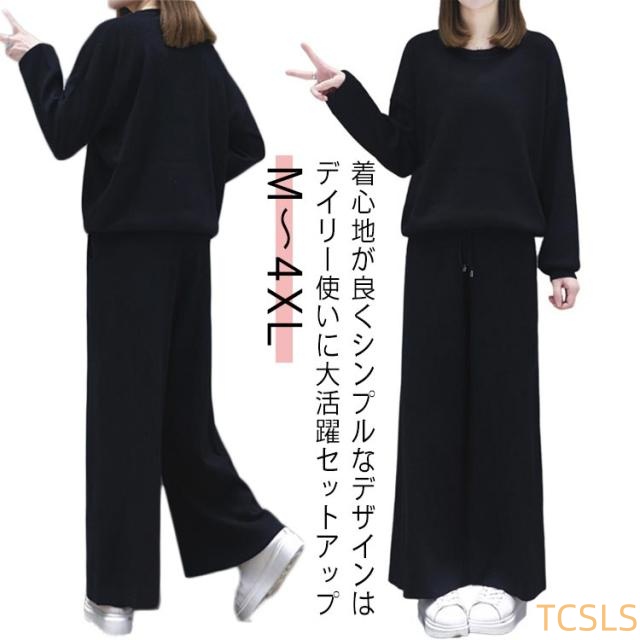 セットアップ ブラック レディース セットアップ ワイドパンツ トレーナー カジュアル 春秋 長袖 大人女性 部屋着 カジュアル カジュアルセット ルームウエア ゆったり おしゃれ 大きいサイズ 上下セット 着?せ お出かけ クルーネック プレゼント ギフト