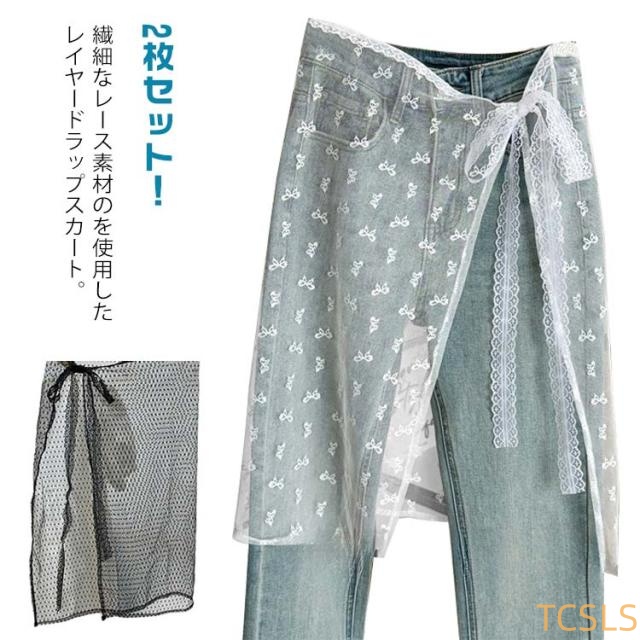 2枚セット ラップスカート シアー レース レイヤード スカート 総レース 刺繍 付け裾 レディース 巻きスカート シースルー 透け感 レイヤード 重ね着 ボトムス 花柄 ドット柄 ハート柄 蝶柄 ひざ丈 韓国風 SNS話題 送料無料