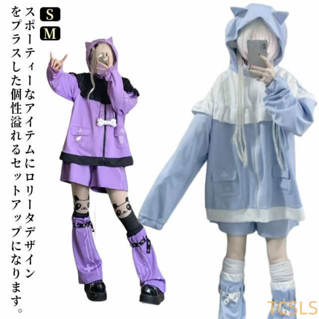 猫耳 パーカー 水色 地雷系 サブカル ジャージ 3点セット レディース メンズ フリルジャケット ブルゾン ハーフパンツ レッグウォーマー 長袖 上下セット 服 サブカル地雷 天使界隈 天使 水色界隈 原宿系 地雷系量産型 ファッション