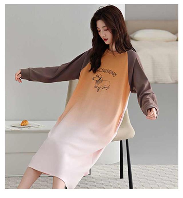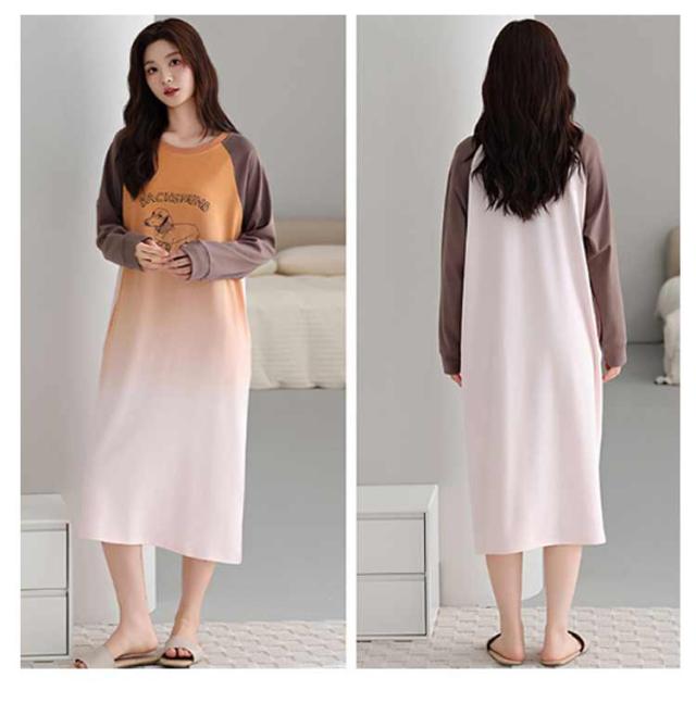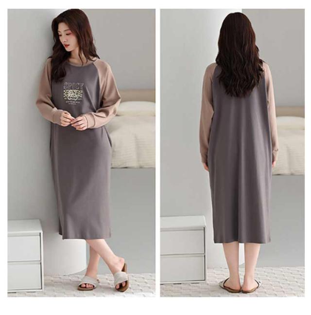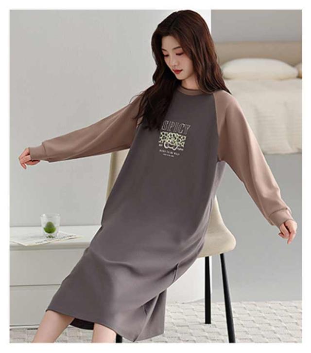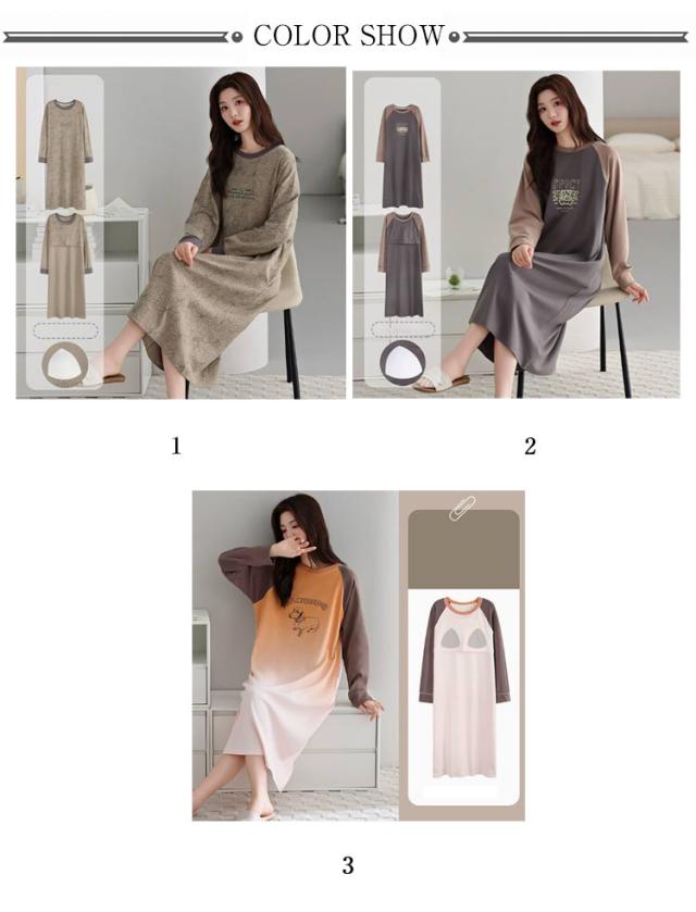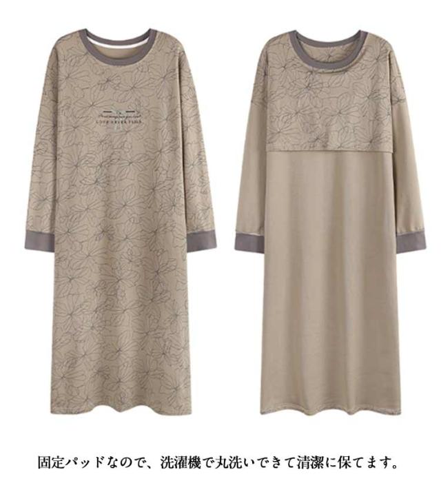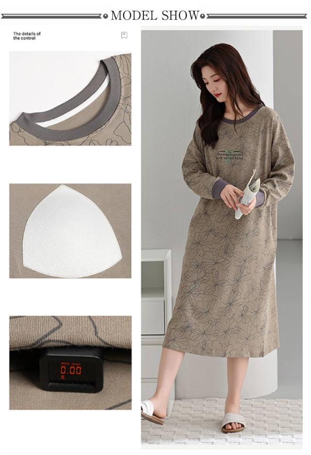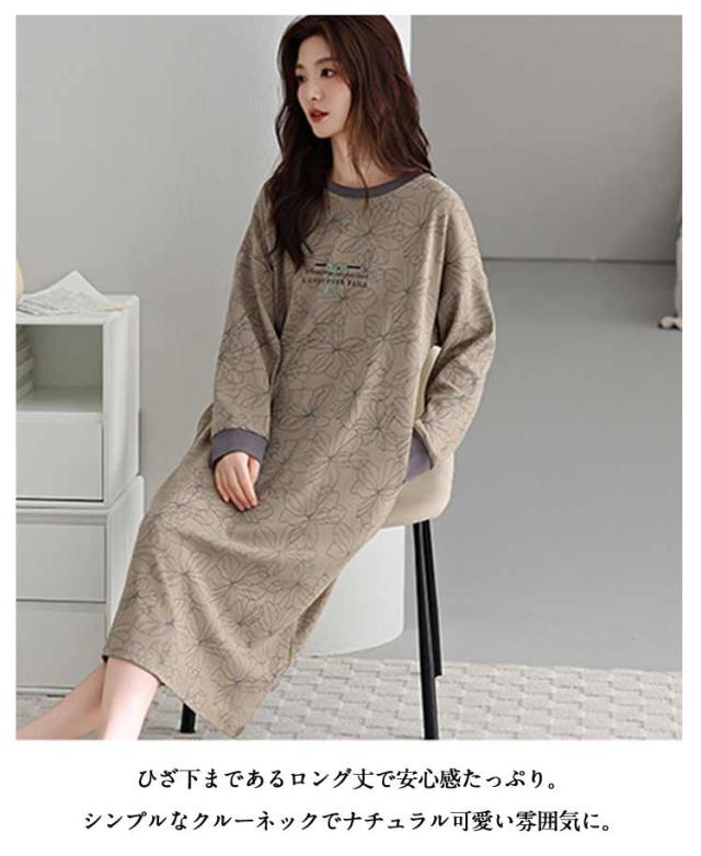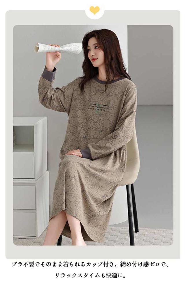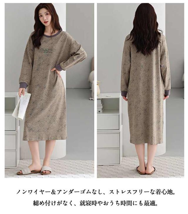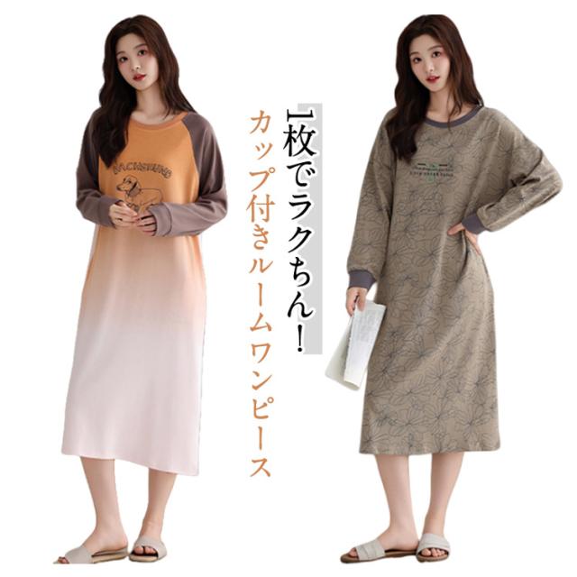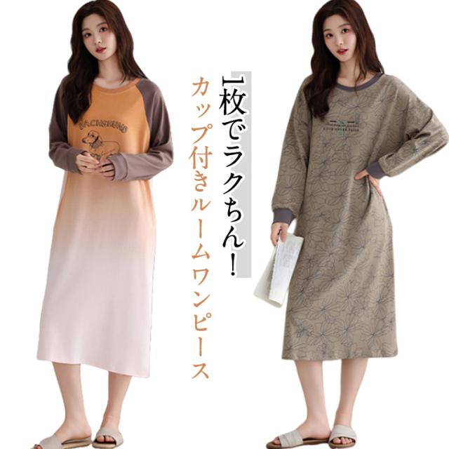 ルームウェア 部屋着 ルームウェア 長袖 綿 カップ付き ナイトウェア アンダーゴムなし ロング丈 クルーネック パジャマ リラックスワンピース ノンワイヤー ロングワンピース 膝下 締め付けない 丸洗いOK パッド付きワンピース 寝間着
