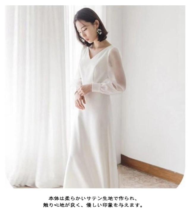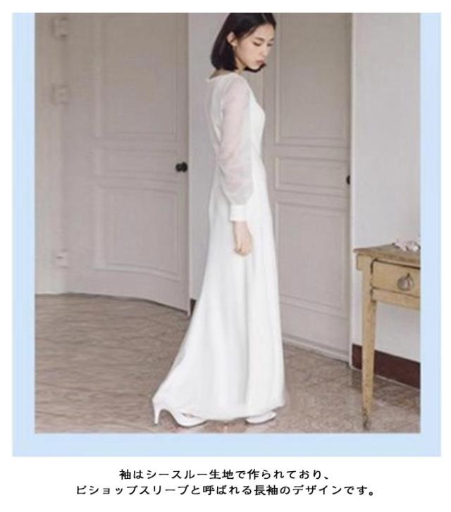 花嫁ドレス フォトウエディング ウエディングドレス 二次会 長袖 カジュアル 撮影 前撮り パーティードレス 後撮り ウエディングドレス ビーチフォト ホワイト 白 シンプル ナチュラル 安い お花嫁ドレス 海外挙式 披露宴 結婚式 演奏会 発表会 パッド付き