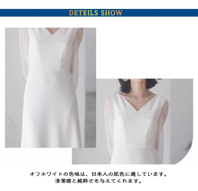 | ロングドレス XS-XXL このドレスは、Vネックとスレンダーラインのシルエットが特徴で、女性らしさを引き立てます。 本体は柔らかいサテン生地で作られ、触り心地が良く、優しい印象を与えます。 袖はシースルー生地で作られており、ビショップスリーブと呼ばれる長袖のデザインです。 背中と袖口はクルミボタンで飾られており、上品さとモダンさが一体となっています。 オフホワイトの色味は、日本人の肌色に適しています。清潔感と純粋さを与えてくれます。 高品質柔らかい素材を採用し、フィット感がよく、窮屈感なく快適な着用感を楽しめます。 ウェディングシーンで花嫁の圧倒的な支持を集めるスレンダーラインに、 流行のデコルテカバーを組み合わせることで今時花嫁によく似合います。 ウエディング・フォトウエディング・ガーデンウェディング・結婚式の2次会・前撮り/後撮り ・ビーチ撮影用・ロケーション撮影・写真用・ 披露宴・セルフ前撮り用・パーティー・など様々なシーンにご利用いただけます。 | |