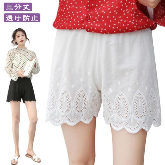 透け防止 透け ナチュラル ショート丈 インナーパンツ 三分丈 防止 ペチコート ペチパンツ 透け 白 インナー 綿 夏 秋 パンツ 黒 ゆったり コットン ワンピース下 下着 裾 刺繍 シンプル おしゃれ かわいい 大きいサイズ スカラップ