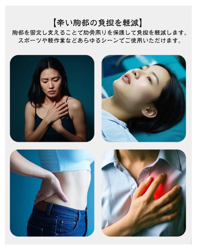 | 肋骨サポーター 2タイプ マジックテープ式 【辛い胸部の負担を軽減】 胸部を固定し支えることで肋骨周りを保護して負担を軽減します。 スポーツや軽作業などあらゆるシーンでご使用いただけます。 【通気性素材で快適な着け心地】 通気性の良い素材なので長時間着用しても蒸れにくく快適に使用できます。 【ズレにくい肩紐付き】 肩紐が付いているので、ズレにくくしっかりと胸部をサポートします。 【男女兼用】 マジックテープ式の伸縮バンド:胸部を上下に分割された伸縮バンドですので、男女問わず体型に合わせて固定することができます。 | |