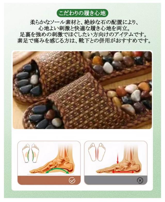 | 自然石が足つぼを刺激。足の健康は体の健康に反映します!天然石健康サンダル。 【歩くだけで気持ち良い刺激を】足裏全体にちりばめられた天然石が、歩くたびに心地よい刺激を与えます。独自の配置で、足裏の重要なツボを優しく刺激。 足に癒しのひとときを提供します。体重のかかる部分には大きめの石を、デリケートな部分には少し小さめの石を配置することで、快適な足裏ケアを実現しました。 【 清潔&快適な着用感】通気性の良い素材を採用し、蒸れにくく清潔に使用できます。オープントゥデザインで、つま先部分の通気性も確保。 夏場の汗ばむ季節でも快適にお使いいただけます。 【こだわりの履き心地】柔らかなソール素材と、絶妙な石の配置により、心地よい刺激と快適な履き心地を両立。足裏を強めの刺激でほぐしたい方向けのアイテムです。 素足で痛みを感じる方は、靴下との併用がおすすめです。 【滑りにくく静音設計】ソール部分には滑りにくい凹凸加工を施し、フローリングでも滑りにくくパタパタと音がしにくい設計なので ノンストレスな使用感。 【ひんやり心地いい】天然石の冷たい感触が、暑い季節の足元を心地よく刺激。足のケアに最適です。火照りやすい足をナチュラルにクールダウンできます。 男女問わずお使いいただけるヘルシースリッパは、大切な方へのギフトとしても人気です。快適な履き心地で、健康志向の方への贈り物として喜ばれています。 | |