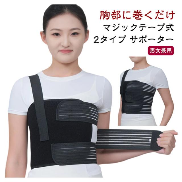| 肋骨サポーター 2タイプ マジックテープ式 【辛い胸部の負担を軽減】 胸部を固定し支えることで肋骨周りを保護して負担を軽減します。 スポーツや軽作業などあらゆるシーンでご使用いただけます。 【通気性素材で快適な着け心地】 通気性の良い素材なので長時間着用しても蒸れにくく快適に使用できます。 【ズレにくい肩紐付き】 肩紐が付いているので、ズレにくくしっかりと胸部をサポートします。 【男女兼用】 マジックテープ式の伸縮バンド:胸部を上下に分割された伸縮バンドですので、男女問わず体型に合わせて固定することができます。 | |