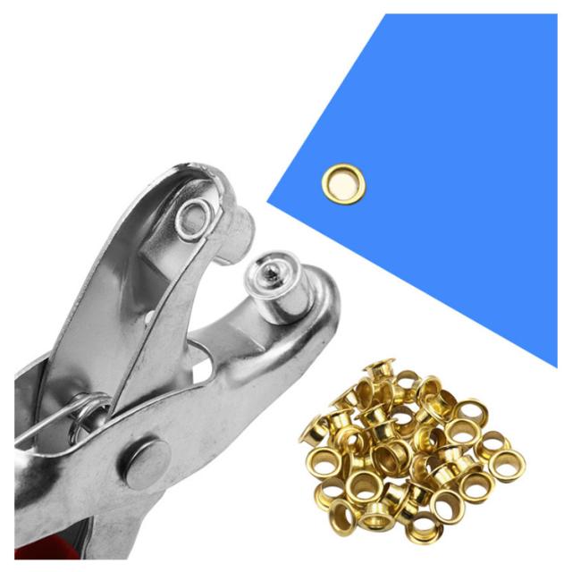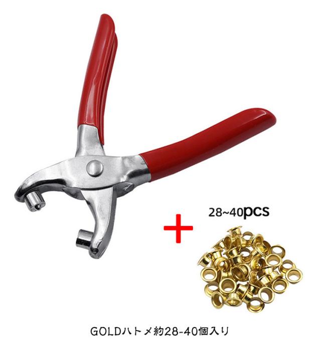 | \ハンディサイズで扱い易いハトメパンチSET/ハトメパンチ(4mm) GOLDハトメ約28-40個入り ジーンズやベルトのカスタムやスニーカーリメイク、 キャンプ用品の補修・補強の他、 ブルーシートや庭のサンカーテン作成にも向くハンディ工具です。 シンプル形状だから扱い易く レザークラフト初心者にもぴったり♪ | |