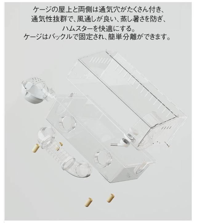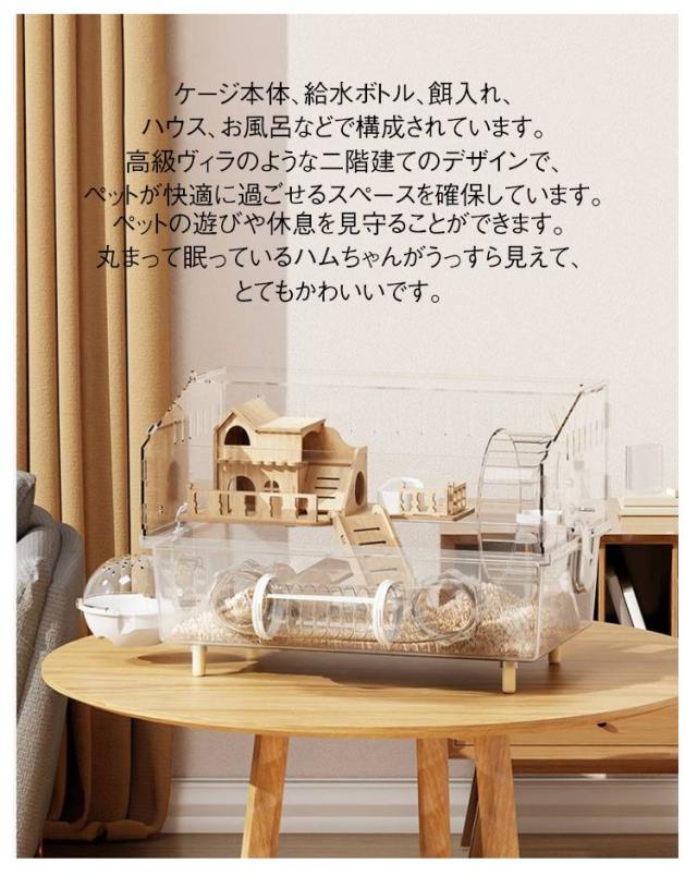 | 【ハムスター用ケージ 2階建て 透明 組立簡単】 広々アクリルケージでハムスターの楽園を!脱走防止&静音設計で多頭飼いも安心。 お手入れ簡単なフルセットだから、初心者もすぐスタート。 ケージ本体、給水ボトル、餌入れ、ハウス、お風呂などで構成されています。 高級ヴィラのような二階建てのデザインで、ペットが快適に過ごせるスペースを確保しています。 静かで回りができるまわし車付いて、ハムスターの運動不足を解消することができます。 どの角度からでもペットの動きが見え、楽しい観察時間を提供します。 ペットの遊びや休息を見守ることができます。丸まって眠っているハムちゃんがうっすら見えて、とてもかわいいです。 ケージの屋上と両側は通気穴がたくさん付き、通気性抜群で、風通しが良い、蒸し暑さを防ぎ、ハムスターを快適にする。 開放感が あり通気性に優れているため、湿気、ニオイや熱がこもりません。 ケージはバックルで固定され、簡単分離ができます。 引っ越しや収納・運送にも便利です。一回で木屑やゴミを出すことできます。衛生的な住まいを提供し、ペットの健康をサポートします。 | |