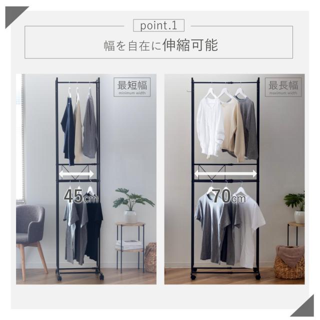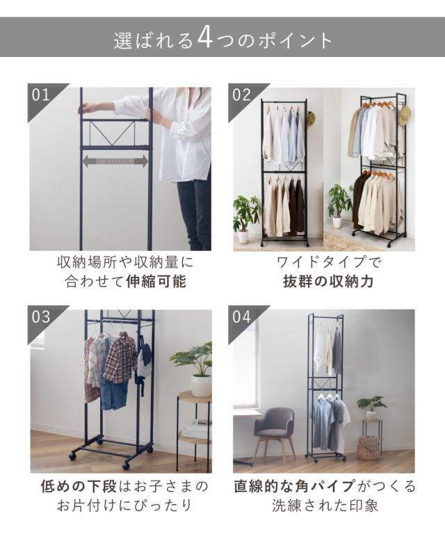 ハンガーラック 2段 ワイド 伸縮タイプ キャスター付き ( コートハンガー パイプハンガー 洋服掛け コート掛け 収納 洋服 掛け 衣類 収納用品 衣類収納 ラック ハンガー掛け おしゃれ リビング 玄関 洗濯物干し )