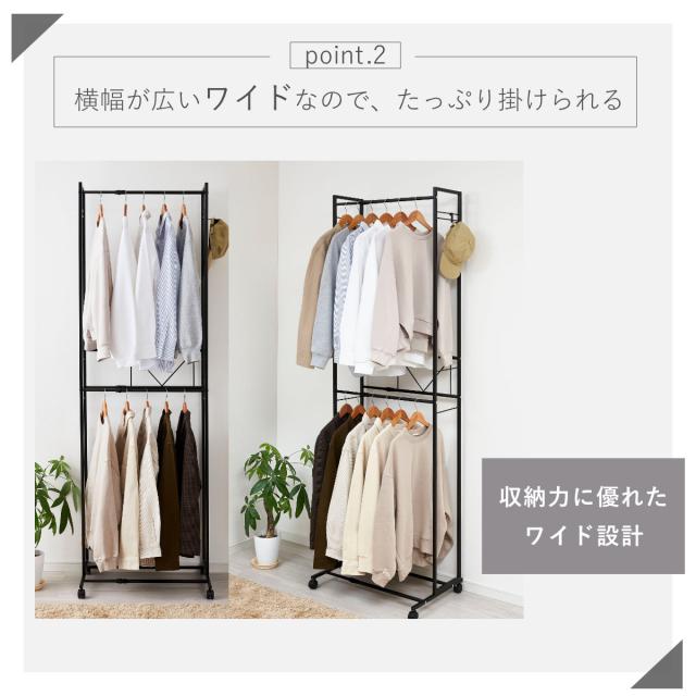 横幅が広いワイド設計に加え、上下2段のバーに掛けられるので、たっぷり収納できます。