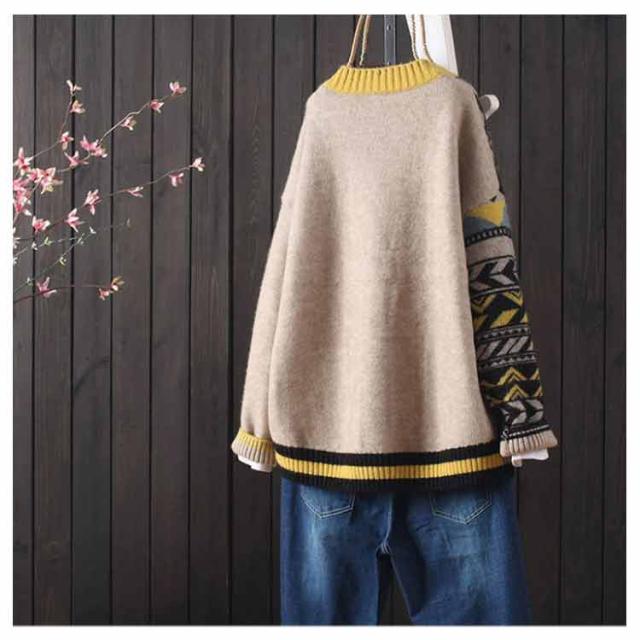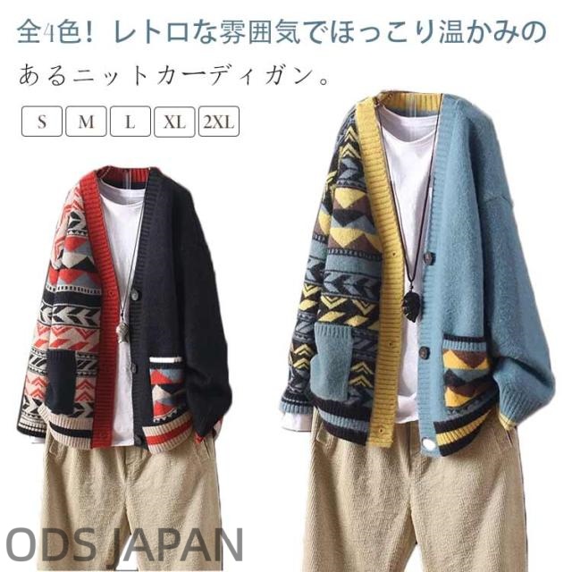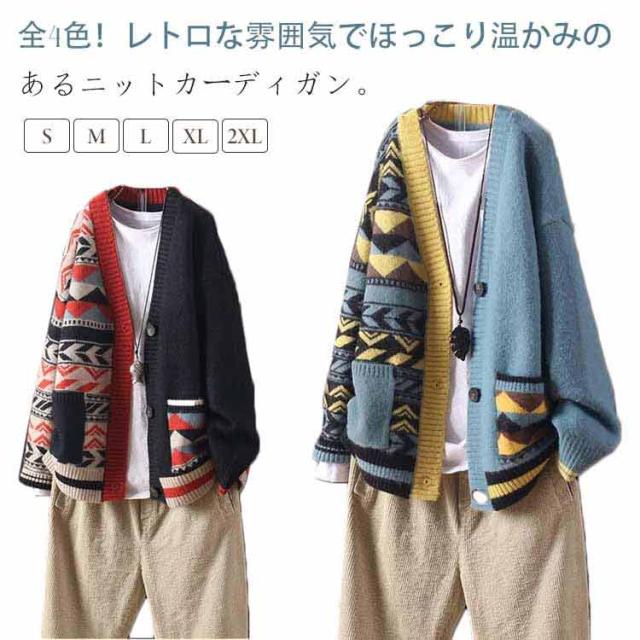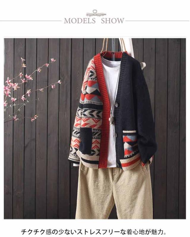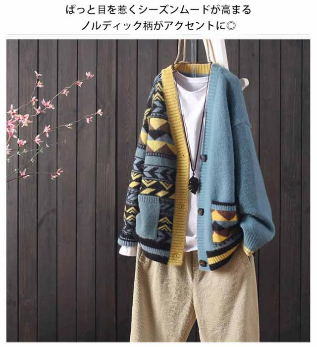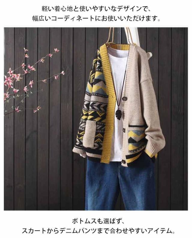 送料無料 秋 ニットカーディガン 配色 エスニック柄 カラフル カーディガン Vネック ポケット付き 羽織り 寒さ対策 ライトアウター 春 ゆったり 体型カバー 暖かい