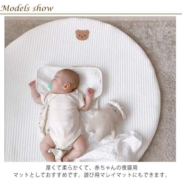 | フローリングに敷くだけでごろ寝スペースの出来上がり! 厚くて柔らかくて、赤ちゃんの夜寝用マットとしておすすめです。遊び用マレイマットにもできます。 また、お子様のお遊びマットとして、おむつ換えやごろ寝、ママのラグマットとしても使えます。 お子様の成長記録の記念撮影や話題の「寝相アート」の背景にもびったりのかわいいデザインのマットです。 | |