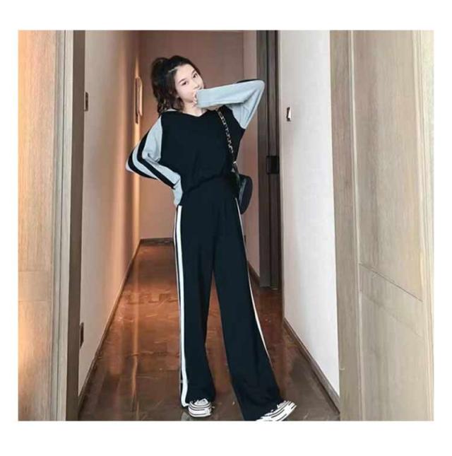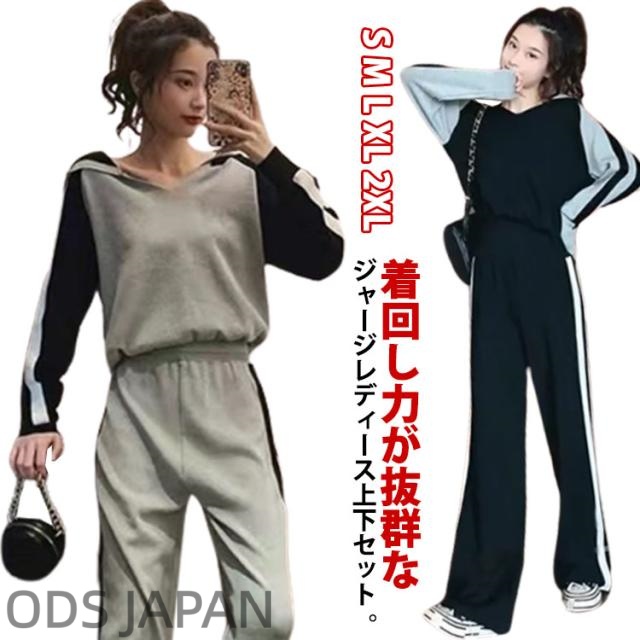 ジャージ レディース セットアップ レディース パンツセット パーカー きれいめ カジュアル おしゃれ Vネック ジャージ ワイドパンツ ハイウエスト ブラック 黒 グレー 20代 30代 40代 50代