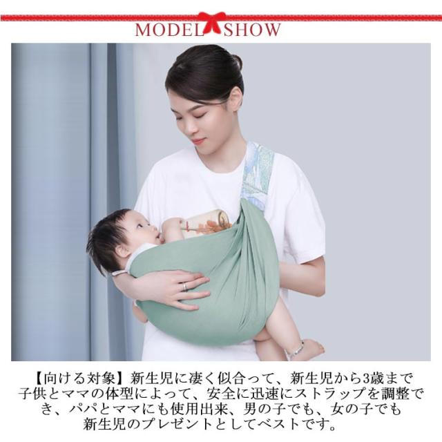 | (赤ちゃんが居心地のいいベビースリングです)ベビースリングは子宮をシミュレートしたデザインを採用し、新生児がベビースリングを使用すると、まるで母親の子宮の中にいるような感覚になりる。新生児に完全な安心感を与え、高品質の睡眠品質を実現できる。赤ちゃんの発育と成長をよりよく助けることができる。 (心地よい材質)軽くて通気性が良くて、授乳に便利です。酷暑酷暑酷暑で赤ちゃんの毛細血管の毛穴の熱放散が遮られ、体温上昇、汗疹になりやすい、赤ちゃんにとって通気性の良いスリングが重宝です。 (ママの体の負担を軽減する)赤ちゃんの体重を肩の上だけで支える従来の抱っこ紐と違って、肩全体を覆う独自の構造で、腰と肩に集中する重量を均等に分散します。腰ベルトからの腰や骨盤への負担も最小化。肩や抱き方を換えることができるので、ママもずっとスリングを着けていても快適です。 (向ける対象)新生児に凄く似合って、新生児から3歳まで、子供とママの体型によって、安全に迅速にストラップを調整でき、パパとママにも使用出来、男の子でも、女の子でも、新生児のプレゼントとしてベストです。 (携帯便利なベビースリングです)超軽量なので、外に使用必要がないときにいつでもカバンに入れるまたは子供用カートに掛けることができます。 | |