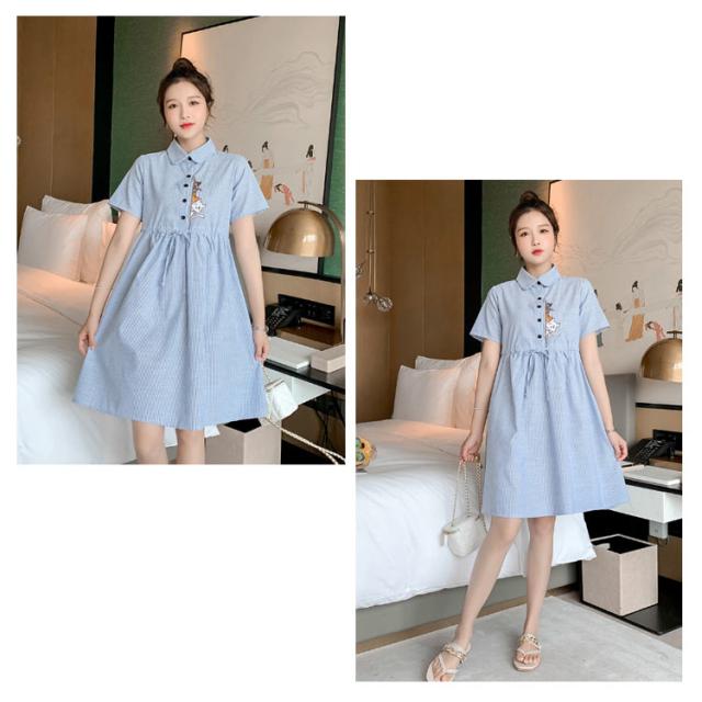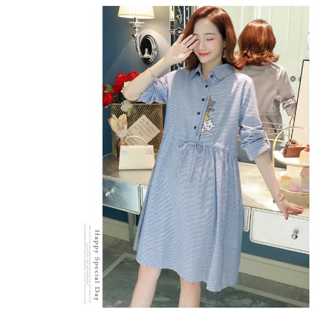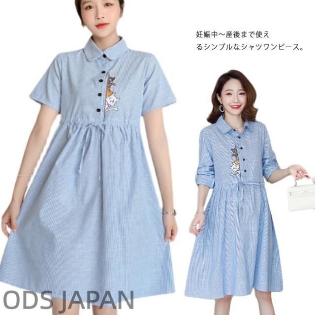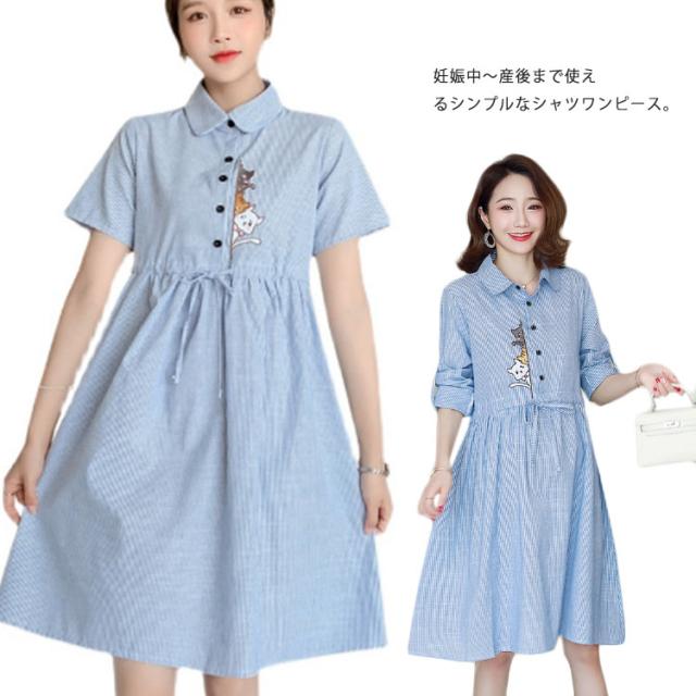 【送料無料】マタニティ ワンピース シャツワンピース 半袖 長袖 授乳服 授乳 産後 臨月 妊婦服 パジャマ ルームウエア ギャザーシャツ ボーダー柄 ワンピ ウェストリボン ウェストマーク ゆったり マタニティ 薄手 産前産後