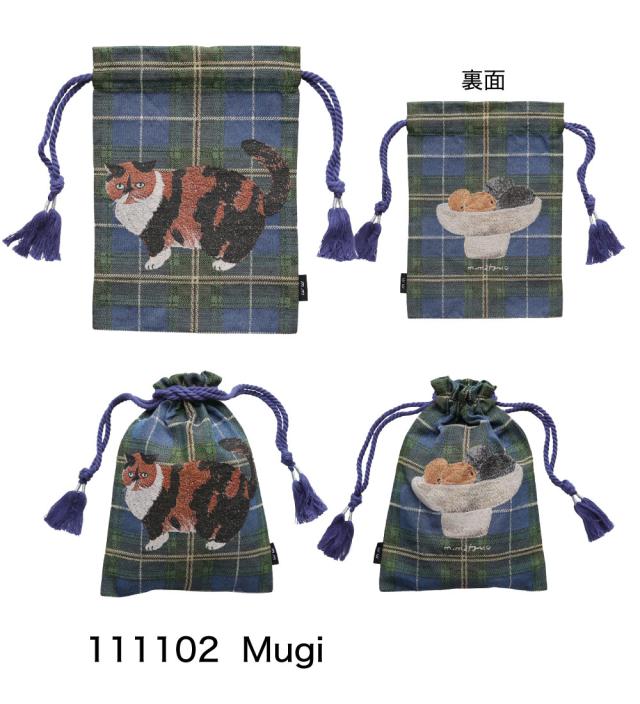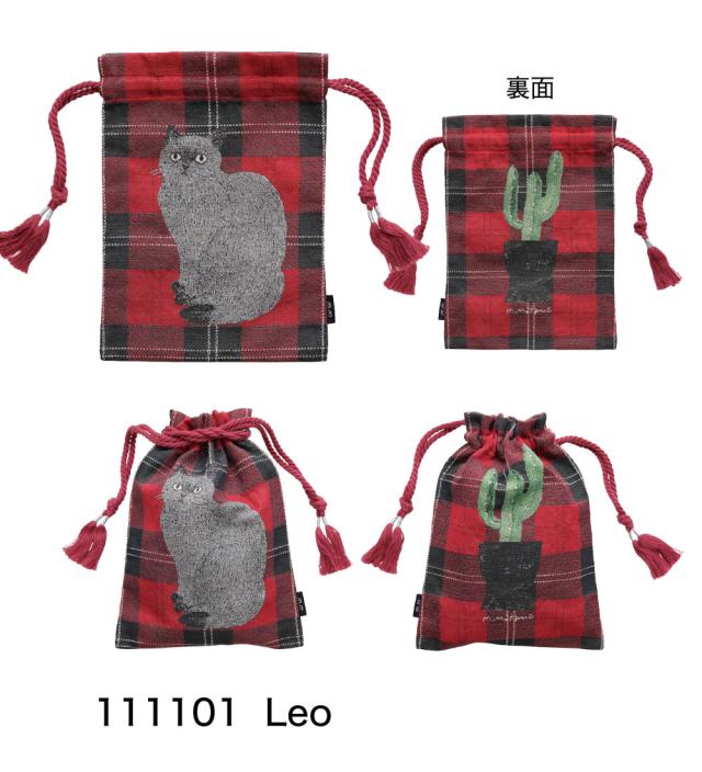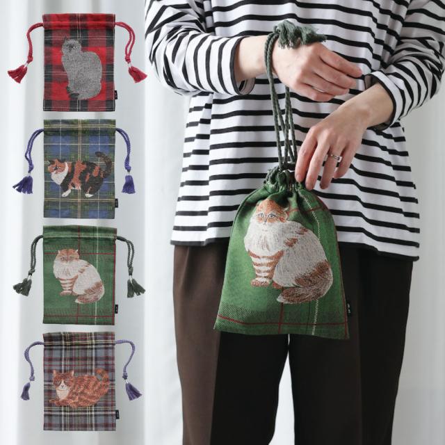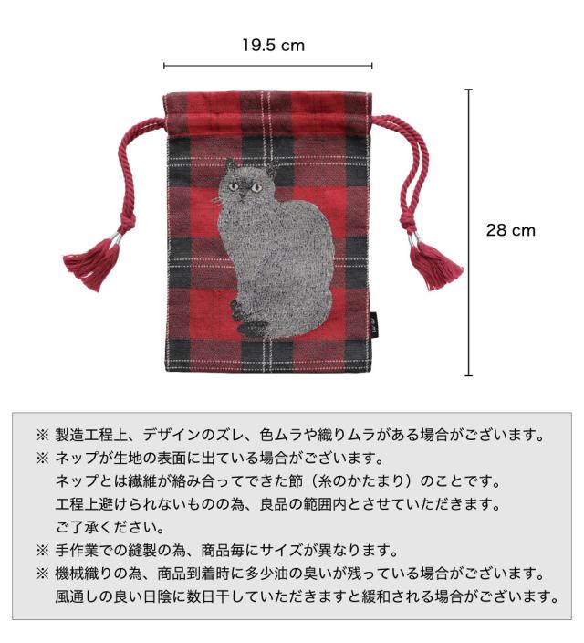 松尾ミユキ チェック柄 巾着|Drawstring bag おしゃれ かわいい チェック アート 猫 ねこ ネコ バッグ ミニバッグ 散歩 買い物 収納 小物 入れ物 お出かけ