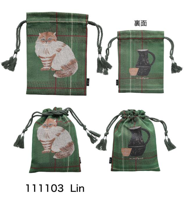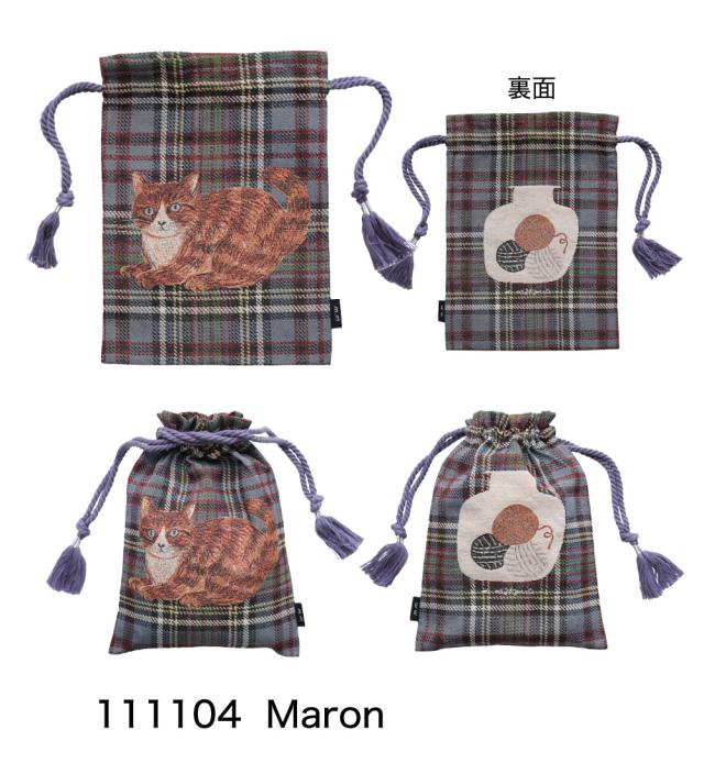 さまざまな表情やしぐさをみせてくれるネコ達が織り込まれた生地を使用して巾着を作りました。
