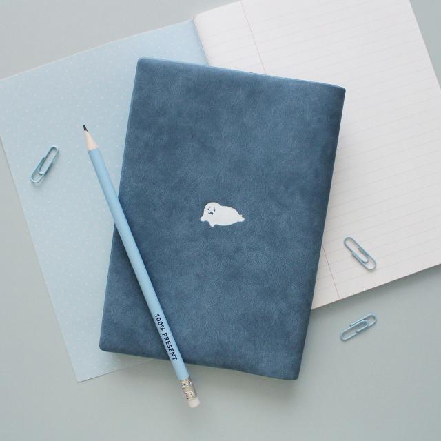 こちらを見つめて茶柱のように浮くアザラシ。裏表紙ではまったりしている姿です。(NEW!)
