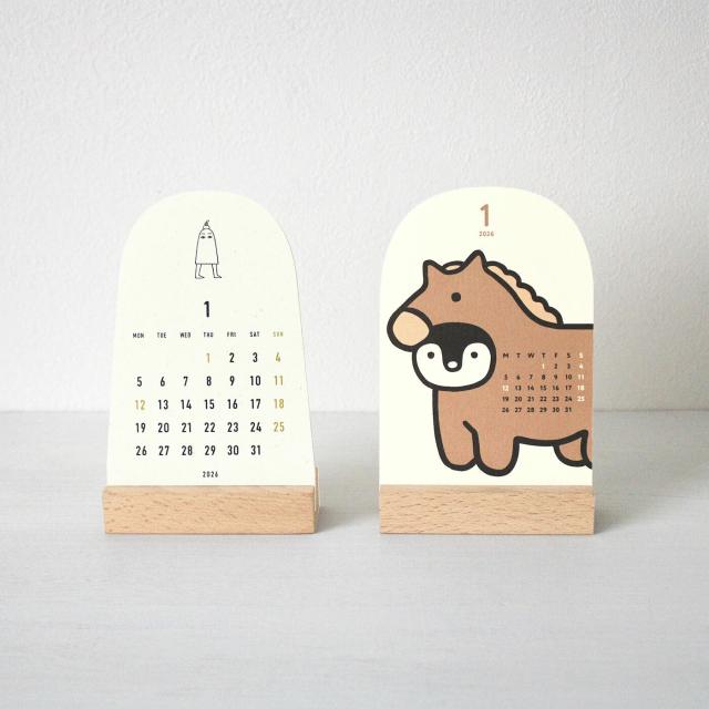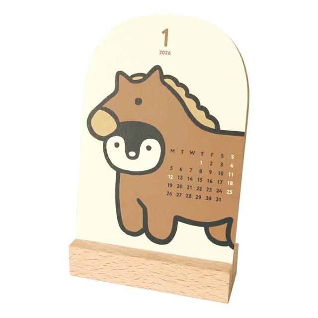 MATOKA マトカ 2026年 卓上カレンダー 木製スタンドタイプ(月曜始まり)『KIGURUMI|着ぐるみ』ダイカット ペンギン 干支 午 馬 動物