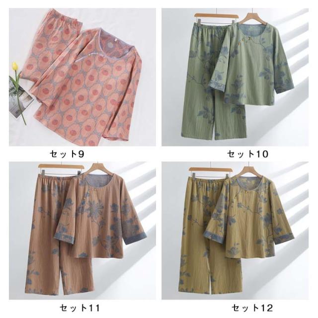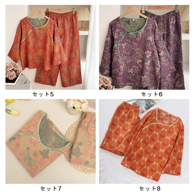 プルオーバー Wガーゼ 綿100% おしゃれ 上下セット 長袖パジャマ 総柄 秋 花柄 中国風 長ズボン ダブルガーゼ 春 ルームウェア 長袖パジャマ チャイナボタン レディース セットアップ ナイトウェア 部屋着 婦人服 ミセス 祖母 敬老の日 プレゼント 二重ガーゼ