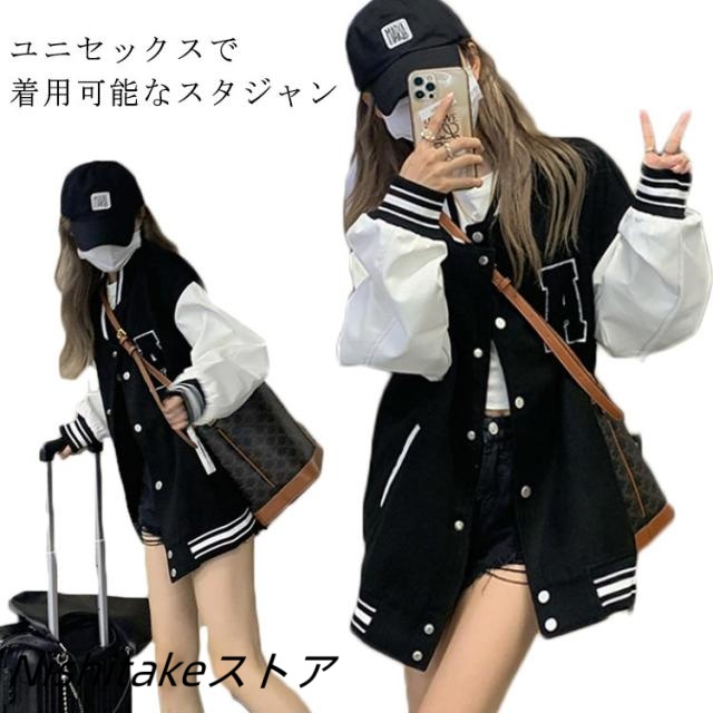 | ユニセックスで着用可能なスタジャン 韓国・ストリート系ファッション好きにオススメです。 程よい厚みがあって、柔らかい生地感で、着やすい仕上がりになります。 首元や裾、袖口の同色リブに配色のラインもアクセントに。 程よい丈感、ボトムスはスキニー・デニム・ワイドパンツなどのコーデも良いです。 オーバーサイズなのでインナーにパーカーなど、ボリューム感のあるアイテムで合わせでも◎ | |
