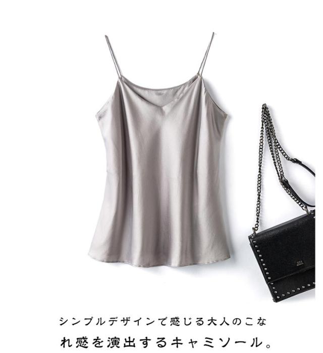 | シンプルデザインで感じる大人のこなれ感を演出するキャミソール。 細いストラップでストレスフリー、シルク生地を使用、夏場に最適! Vネックで落ち着いた上品なスタイル。 オフィス、普段使い、ルームウエア様々なシーンに重宝するなレイヤードトップス。 インナーとしてはもちろん、一枚で単品でも着用いただけます。 | |