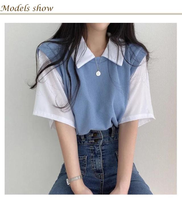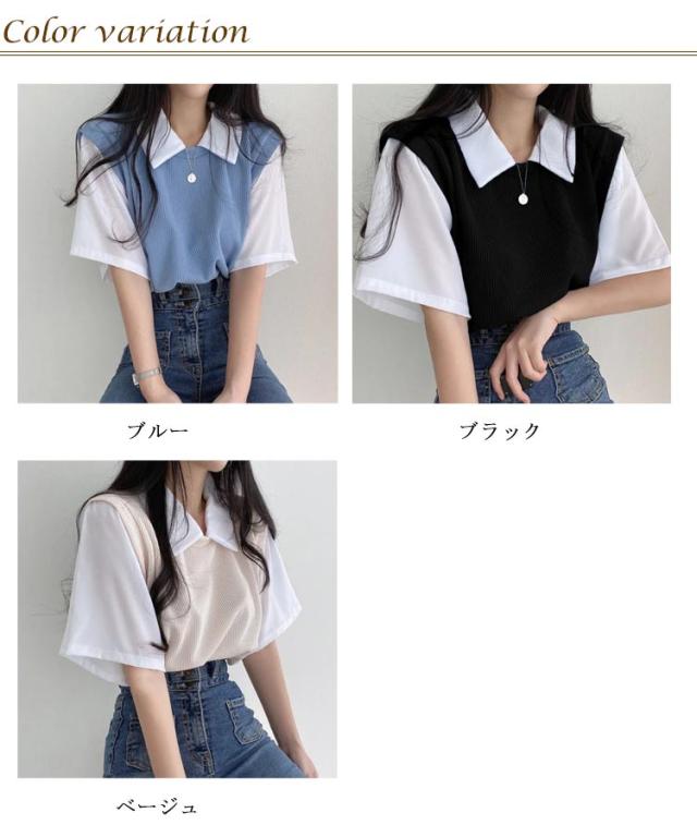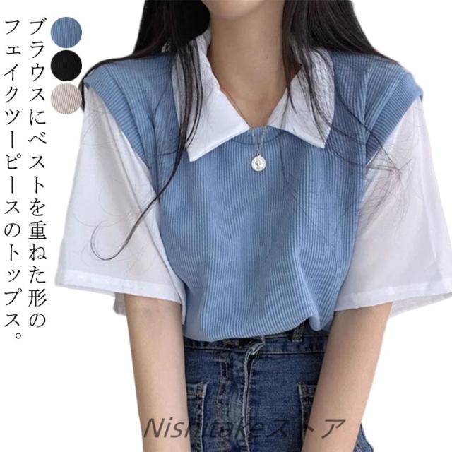 レディース 重ね着風 tシャツ 学生 夏 半袖 シンプル フェイクツーピース 半袖トップス ゆったり プルオーバー スクール 襟付き リラックス 春夏 カジュアル 着回し 普段使い 半袖トップス 通学 ブルー ブラック ベージュ