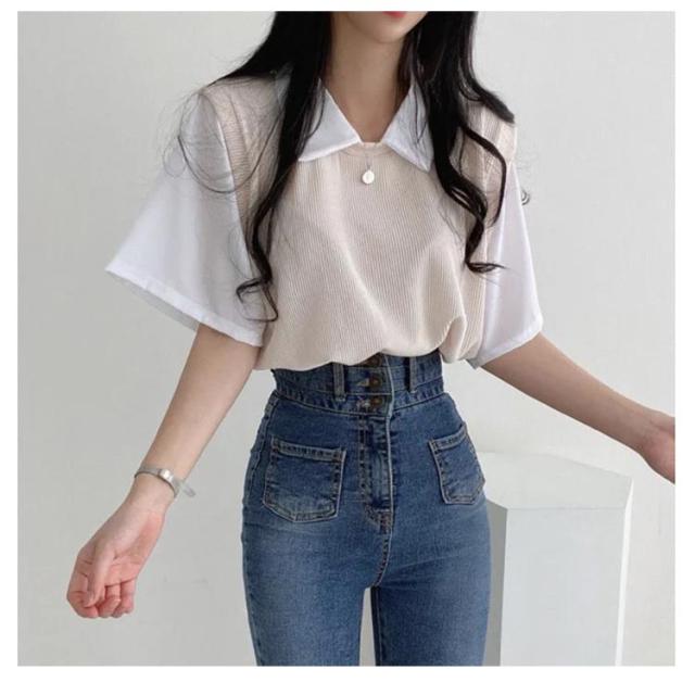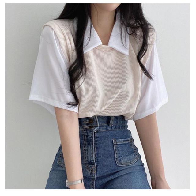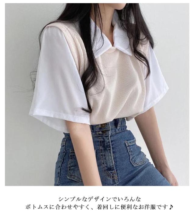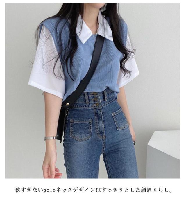 | ブラウスにベストを重ねた形のフェイクツーピースのトップス。 狭すぎないpoloネックデザインはすっきりとした顔周りらし。 レイヤード風のドッキング設計はカジュアルスタイルにぴったり。 余裕を持つシルエットも動きやすい。 通学・普段着はもちろん、部屋着としても快適にお使いいただけます。 シンプルなデザインでいろんなボトムスに合わせやすく、着回しに便利なお洋服です♪ | |