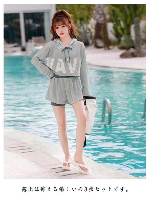 送料無料 水着 中学生 高校生 レディース 3点セット セパレート タンキニ ショートパンツ フード付き レイヤード トップス 体型カバー 女子 洋服見え 韓国 露出控え 大学生 S M L XL