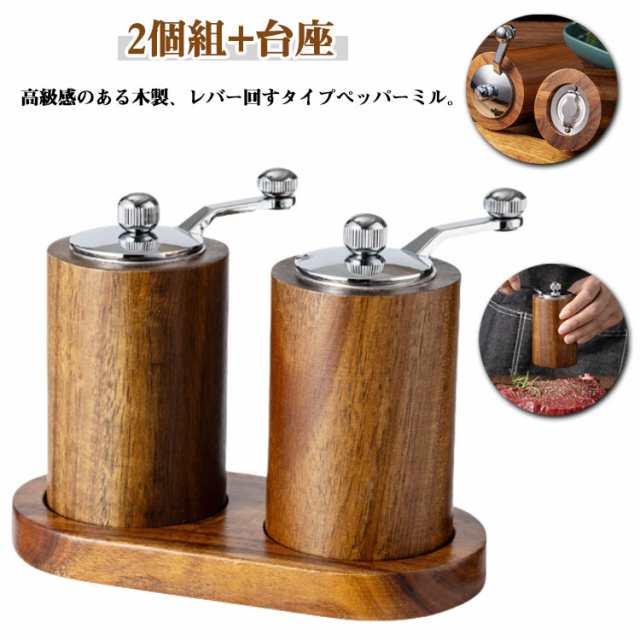 レバー回すタイプ!ペッパーミル 手動 おしゃれ 木製 台座付き 3点セット ペッパー ミル ソルトミル 調味料 スパイスミル 調味料挽き ペッパー挽き 香辛料 木製ペッパーミル 北欧