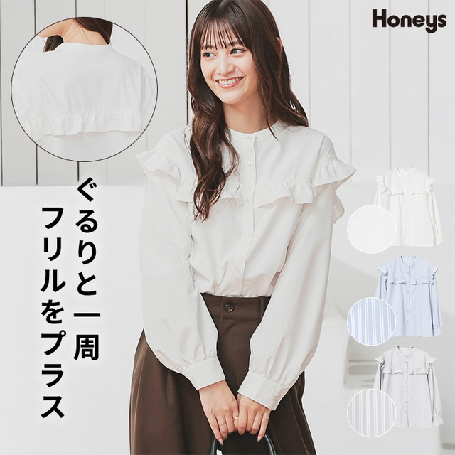 トップス ブラウス 長袖 フリル 無地 ストライプ柄 バンドカラー フロントボタン ガーリー オールシーズン 白 レディース SALE セール Honeys ハニーズ フリルブラウス