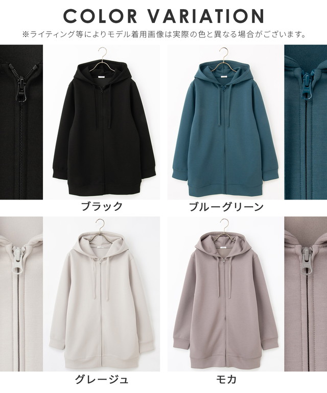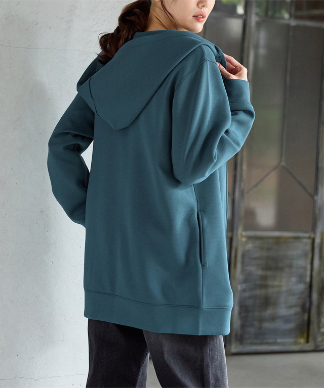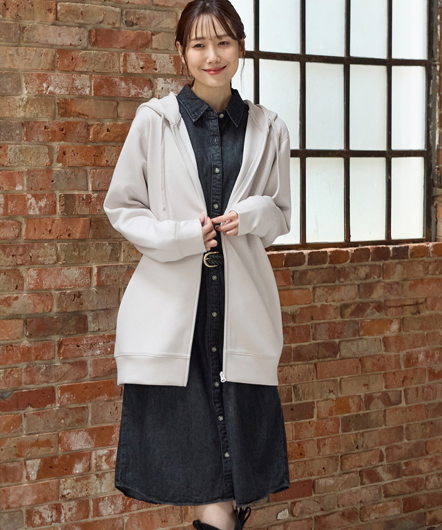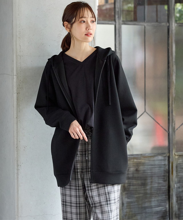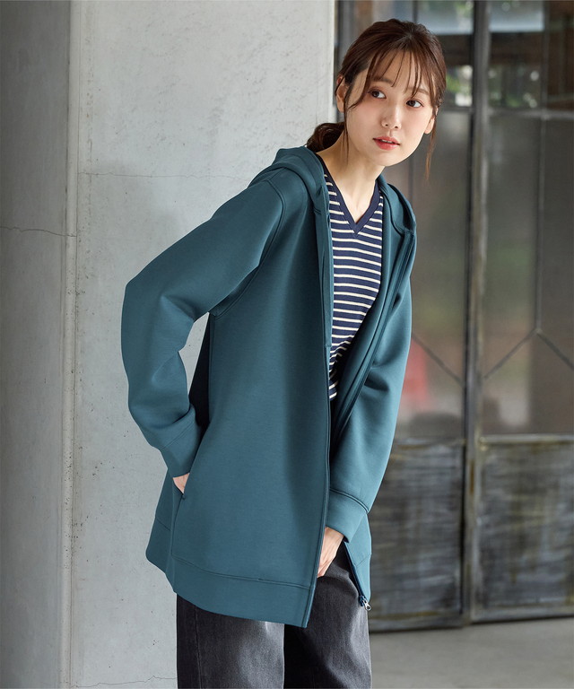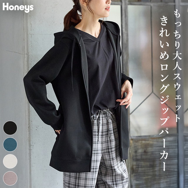 トップス パーカー ロングジップパーカー スウェット 長袖 ストレッチ レーヨン混 無地 ポケット フード付き レディース SALE セール Honeys ハニーズ きれいめロングジップ