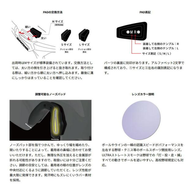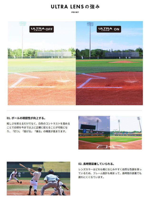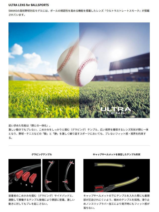 | 特徴 | 激しい動きでもブレない、顔と一体化するアイウェア。 SWANSの高校野球対応モデルには、 ボールの視認性を高める機能を搭載したレンズ 『ウルトラストレートスモーク』が搭載されています。 紫外線や眩しさから眼を護ることはもちろん、 ボールがくっきり・はっきり見えることで プレーのパフォーマンスを高める機能を持った 『守りと攻めを兼ね備えた』レンズです。 ※高校野球規定対応モデル 日本高等学校野球連盟が定める高校野球用具の使用制限により、 公式戦でサングラスを使用する場合は、試合前(メンバー交換時)に 主催者・審判員に申し出て許可を得たもののみ使用が認められています。 |