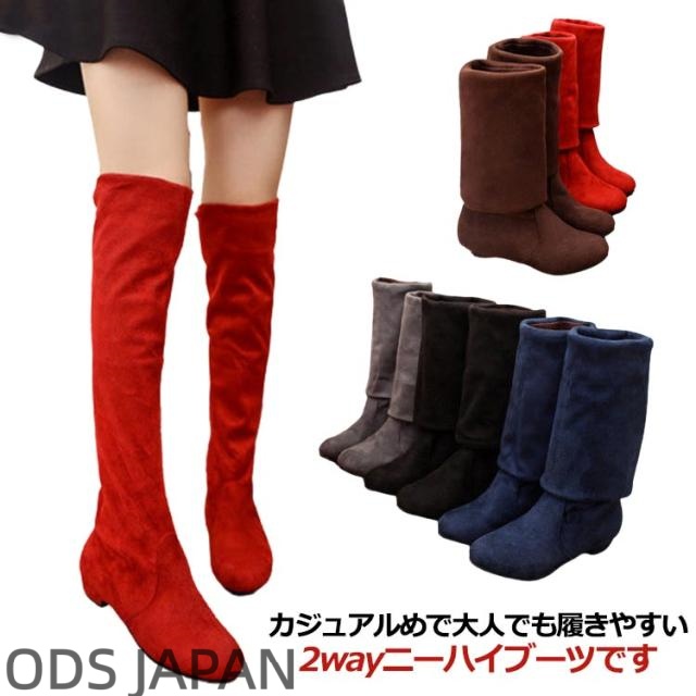 | カジュアルめで大人でも履きやすい2wayニーハイブーツです。 膝部分を折り返して履くこともでき2way仕様となります。 生地が厚くて暖かく、長い丈のロングブーツは寒い秋冬におすすめです。 楽ちんな低ヒールで長時間の立ち仕事や旅行などたくさん歩く日にもおすすめ! 1日中履いていられる楽ちんシューズだから、動き回る日にはピッタリ! | |