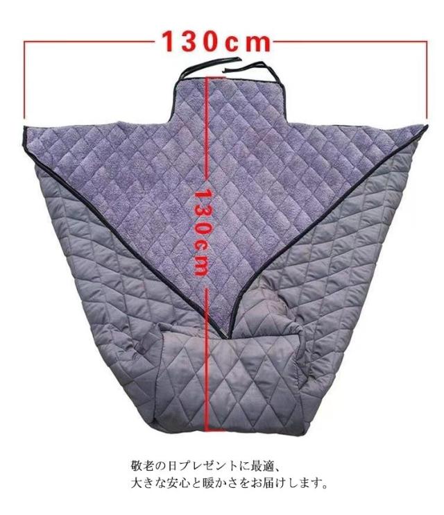 | 車いす用防寒ブランケット クーラーによる冷え対策やアウトドア、ご自宅での普段使いなど様々なシーンに使える! 毛足長めのリッチ素材で、心地よい肌触りのブランケット。 胸元から下はジップアップ式で体をしっかり包み込み、効率よく優しく暖めます。 後ろにひもで固定できるので長時間の移動にもずり落ちてくる心配もありません。 車椅子の冷え対策やアウトドア、ご自宅での普段使いなど様々なシーンに使えます。 敬老の日プレゼントに最適、大きな安心と暖かさをお届けします。 | |