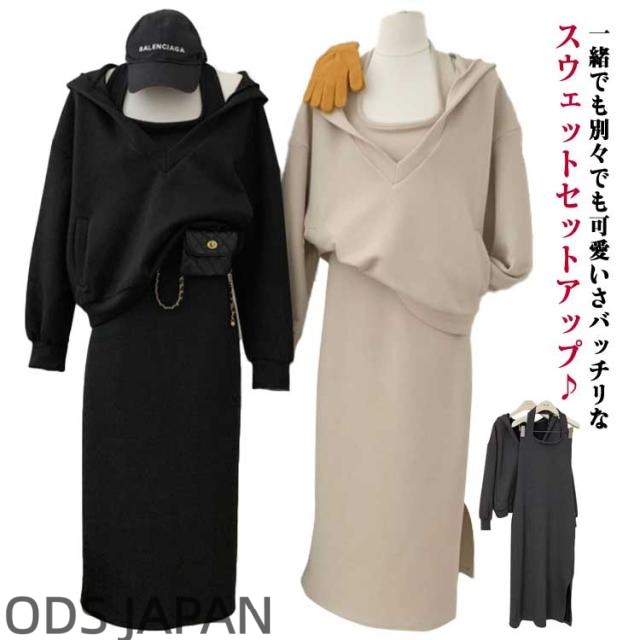 セットアップ レディース 春秋 長袖バーカー ワンピース スウェット パーカー 春夏 カジュアル スカートセットアップ シンプル 無地 ロング丈 スポーツ風 ジャージー ルームウェア 部屋着 3色 韓国風