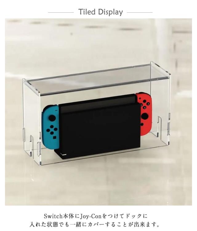 | Switch本体とドックを一緒にカバーする防塵ケース Switch本体にJoy-Conをつけてドックに入れた状態でも一緒にカバーすることが出来ます。 大切なswitchを外部の衝撃、ホコリ、汚れ、水から守ります。 上から被せるだけでSwitch本体とドックをキレイに保管できます。 少し厚みのあるアクリル製は、透明度が高く高級感もあるので、中に入れたswitchをより一層綺麗に魅せてくれます。 ホコリ、水や汚れが透明ケースについた時は濡れたタオルで気軽に拭き掃除できます。 | |