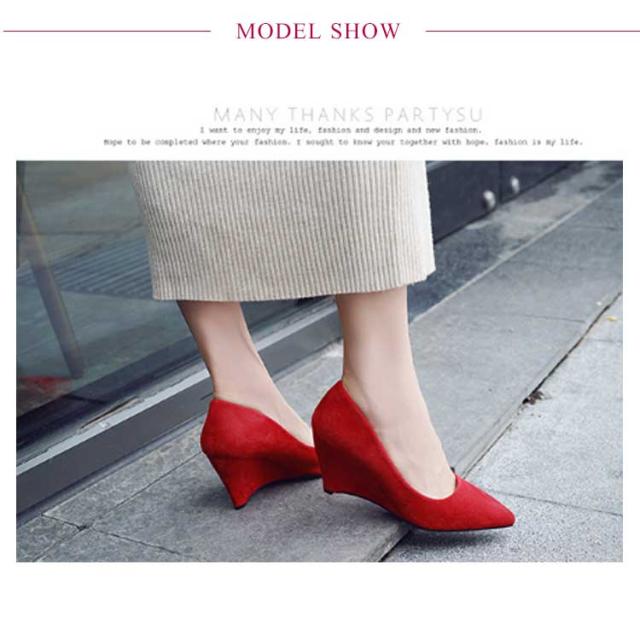 | トレンドに左右されない、シンプルなデザインのパンプス スラッと細く長い足に見せてくれる高さ約7cmのハイヒール。 ウェッジソールはバランスが取りやすく、安定感抜群です。 厚底シューズなのに軽いので、長時間履いても疲れないです。 とっても歩きやすいので、ヒール初心者さんにもおすすめです! 通勤通学のデイリーユースはもちろん、上品なスエード素材を使用しているので、フォーマルな場面にもお使いいただけます。 | |