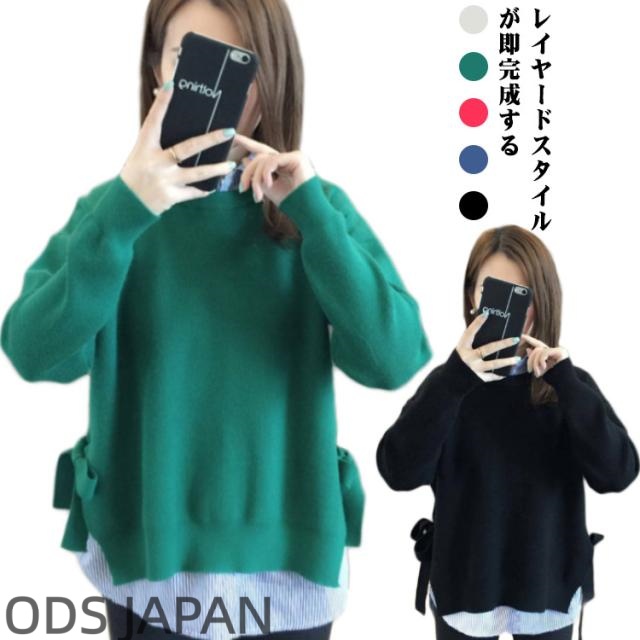 秋 シャツ ニット レディース セーター グリーン ホワイト 冬 グリーン ビッグ レディース ブルー ブルー シャツ セーター ホワイト レイヤード ブラック レッド ビッグ ブラック 重ね着 長袖 レトロ トップス カジュアル きれいめ