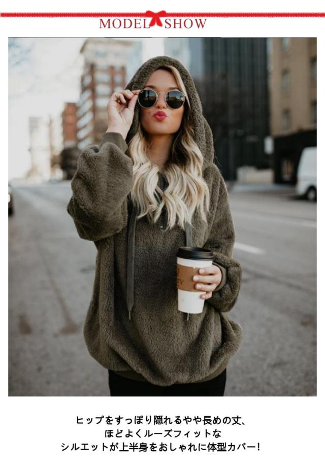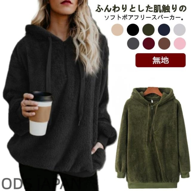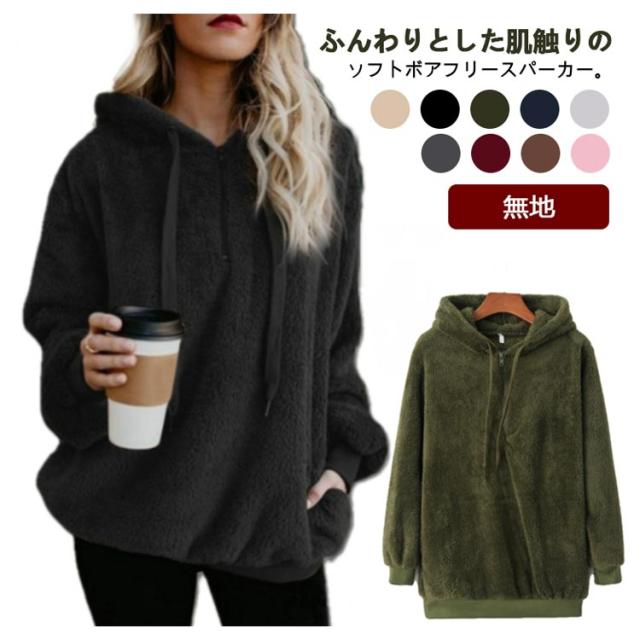 長袖 ボアパーカー ボアパーカー レディース ブルゾン フード付き ボアフリース もこもこ あったか 秋冬 ボアトップス プルオーバー 無地 軽量