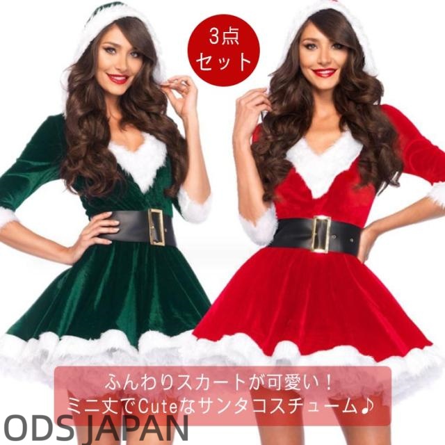 クリスマスコスプレ サンタコス 送料無料 コスプレ衣装 仮装 ワンピース フード付き サンタクロース 送料無料 コスプレ サンタ クリスマス レディース ミニ ワンピース 半袖 五分袖 サンタコスチューム パニエ ウエストベルト 赤 緑 セクシー かわいい 可愛い