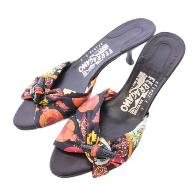 【中古】サルヴァトーレフェラガモ Salvatore Ferragamo サンダル アーモンドトゥ ローヒール リボン 6 黒 ブラック