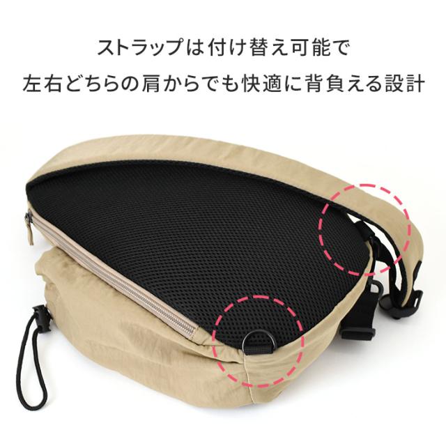 ストラップは付け替え可能で、左右どちらの肩からでも快適に背負える設計。