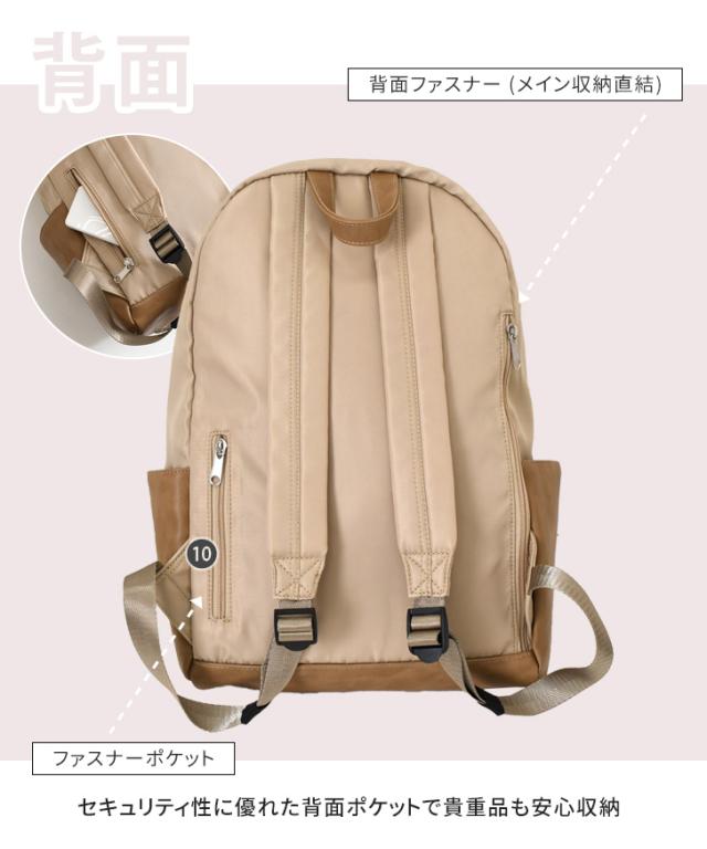 ■仕様:【外側】ファスナーポケット×2、背面ファスナーポケット×1、背面ファスナー(メイン収納直結)×1、サイドポケット×2 【内側】ファスナーポケット×1、オープンポケット×3、ボトルホルダー×1