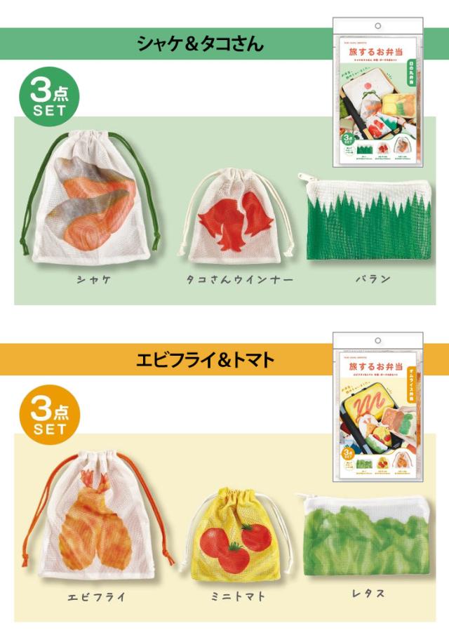 お弁当のおかずをモチーフにしたデザインでシャケ&タコさんとエビフライ&トマトの2種類から選べます