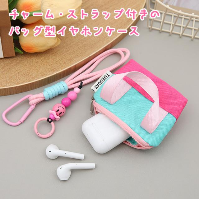 新作 選べる5カラーストラップ&チャーム付きバッグ型ワイヤレスイヤホンケース キーホルダー アクセサリー バッグチャーム バッグアクセサリー ポーチ 小物入れ ミニ 携帯 持ち運び おしゃれ かわいい 小さめ 雑貨